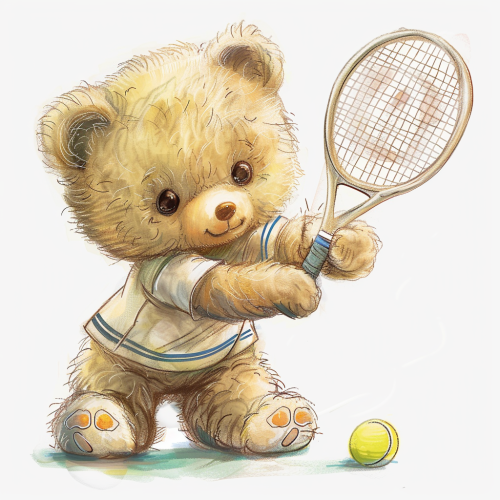 soft fun colors, baby teddy bear clipart, really soft, smooth smiling adorable cute teddy bear in a tennis uniform holding a tennis racket and hitting a ball with it clipart, white background