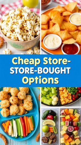 Create an inviting and colorful collage image titled More Budget-Friendly Snack Options. This image should showcase four delicious snack ideas arranged attractively on a lively table setting. Include the following items: Popcorn Bar - Set up a vibrant popcorn bar featuring various toppings like cheese, caramel, and chocolate drizzle. Make it visually appealing and interactive to entertain your guests. Stuffed Mini Peppers - Display a platter of mini bell peppers filled with cream cheese, herbs, or a mix of meats. The colorful peppers should look fresh and appetizing, offering a tasty punch. Cheese and Crackers Platter - Present a simple yet elegant cheese board with an assortment of cheeses, crackers, and some fresh fruit. Arrange it in a way that is easy to assemble and visually impressive. Fruit Skewers - Feature colorful fruit skewers threaded with pieces of pineapple, strawberries, and grapes. Include a small bowl of yogurt dip for added flavor, making the display refreshing and fun.