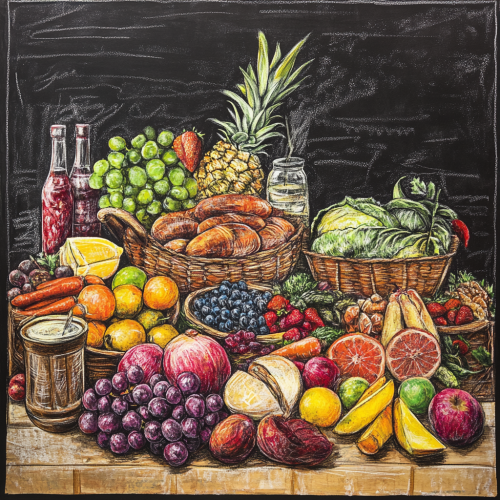 Generate an image of a chalkboard with a colorful chalk drawing of a table full of food. The image should have the quality and detail of a real photograph.