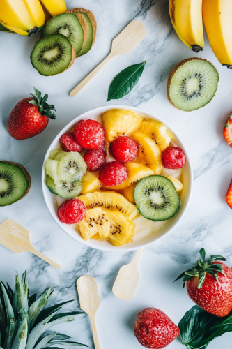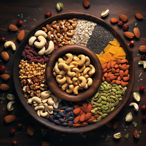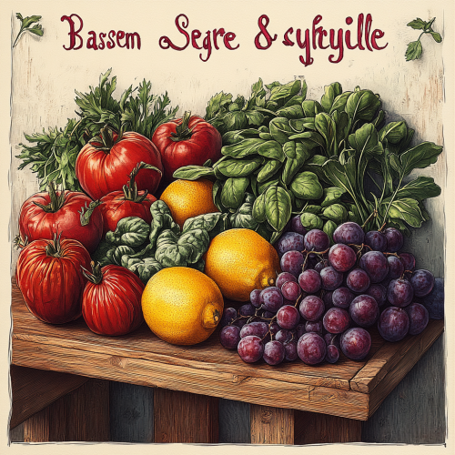 Ein farbenfrohes, illustriertes Titelbild für eine Basen-Säure-Tabelle. Die Illustration zeigt eine Vielzahl von Gemüse & Früchten die entlang einer Skala von basisch bis sauer angeordnet sind und auf einem holztisch liegen. Verwende eine verspielte und künstlerische Darstellung mit kräftigen, lebendigen Farben. Die basische Seite sollte Gemüse wie Spinat, Brokkoli und Gurken zeigen, während die saure Seite Früchte wie Zitronen und Tomaten darstellt. Der Stil sollte handgezeichnet und grafisch wirken, mit weichen Konturen und einer harmonischen Komposition und ebenso kräuter, samen und nüsse inkludieren --s 750 --style raw