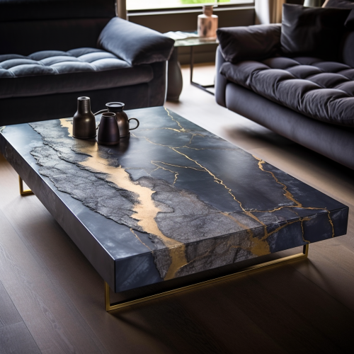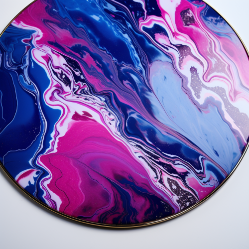 generate a top-down view of a luxurious table surface that uses a crystalline slab with lots of deep magenta contrasting swirls of royal blue and white.