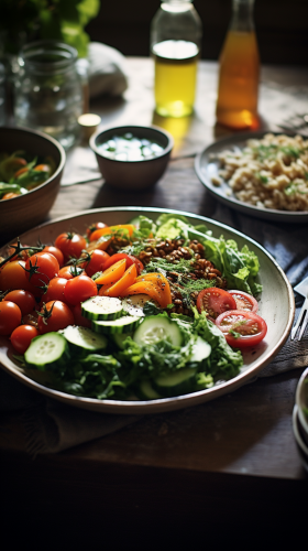 Hyperrealistic traditional Guatemalan fiambre on a dining table, filled with a colorful assortment of meats, vegetables, and garnishes like beets, olives, sausages, cheeses, and eggs. Each ingredient is vividly detailed, showcasing rich textures and vibrant colors. The dish is arranged beautifully, with careful attention to every small component, giving a sense of freshness and deliciousness. The background features a cozy, modest kitchen, not too modern, with warm lighting enhancing the richness of the scene. --s 250