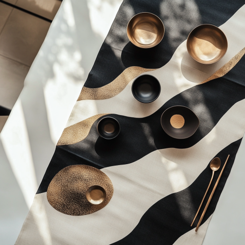 luxury minimal afro zen table cloth designs and crockery, laid out in a cool way on a white surface,looks like a luxury magazine photograph close up, top view