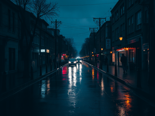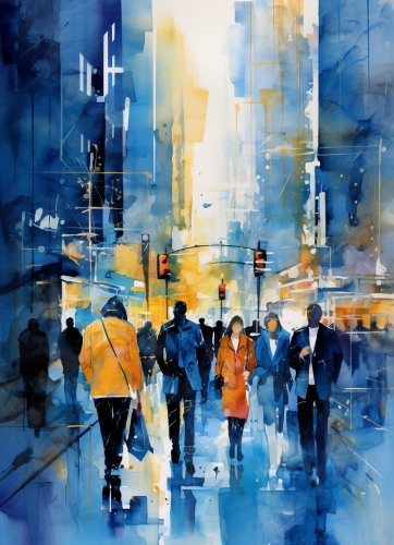 a watercolor painting of people in the street, in the style of fauvist color usage, dark azure and yellow, impressionist light effects, busy compositions, konica auto s3, split toning, lively tableaus --ar 93:128