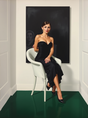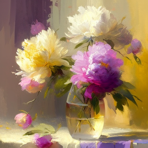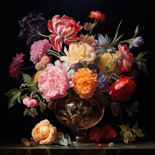 A realistic oil painting showing a sumptuous bouquet in a glass vase. The rich, colorful blooms are meticulously detailed, contrasting with the vase's intricate glasswork. Light and shadow play beautifully in this opulent still life in a dark surrounding.