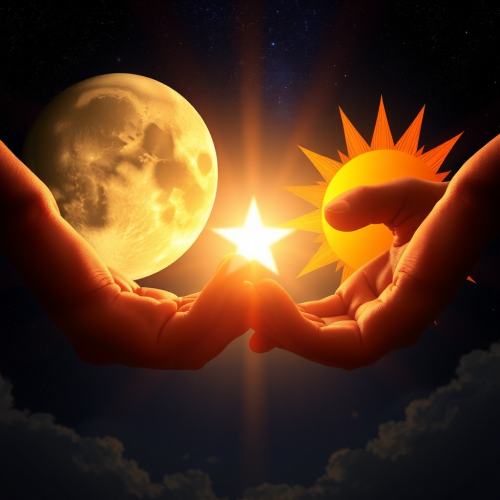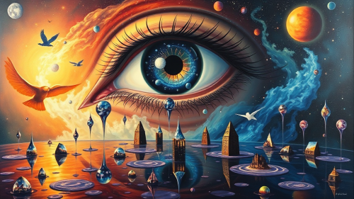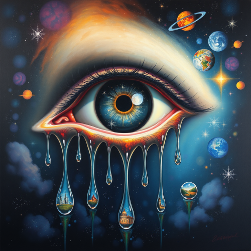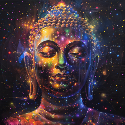 Luminous Buddha, oil painting, up view, rainbow light, dark cosmic starry background, oc rendering--ar4:3