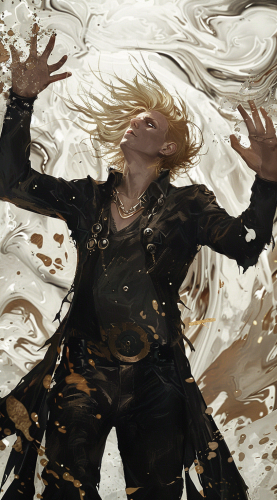 an anime male with blonde hair standing and waving his arms, in the style of dark black and light beige, hopi art, dark white and light gold, meticulous design, solapunk, mural painting, close up v6 --ar 71:128