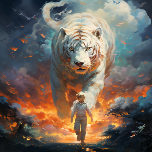 Children painting, a white tiger walks in the sky with colorful clouds and warm light --s 250