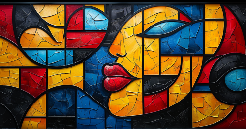 a yellow painting with colorful lines, in the style of artistic doodles, stained-glass, maori art, vivid color blocks, colorful absurdism, graphic black outlines, light crimson and indigo --ar 128:67 --v 6.0 --s 750