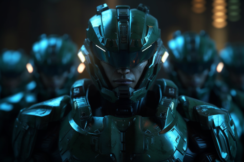 Close up portrait of Dangerous Sci-fi Army, fully dressed in light Malachit armor, Looks brutal, Their armor looks like retrofuturistic but yet dangerous and deadly atmosphere, dark, brutal, The armor glinted in the dim light of the night, the simple form and smooth lines a testament to its military technology, inspired by Adam Baines, by Craig Mullins, digital art, sci-fi, dark sci-fi, dark, details by Frank Frazetta, digital painting, futuristic but colorful shading, light particles, natural lighting, global illumination, ambient lights, volumetric lighting, painting by Jonathan Ching, futurism aesthetic, stunning, Artstation, masterpiece, award-winning art --ar 3:2 --v 5.1 --s 600