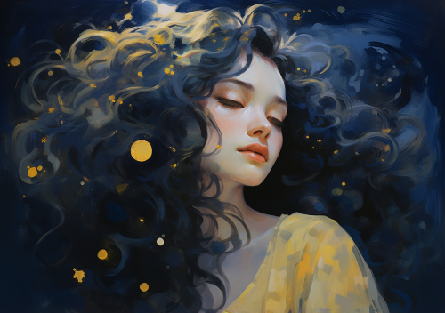 a girl with her moonlit hair and starry sky, in the style of the stars art group (xing xing), gentle expressions, paintings, trapped emotions depicted, i can't believe how beautiful this is, light yellow and dark blue, oil paintings --ar 10:7