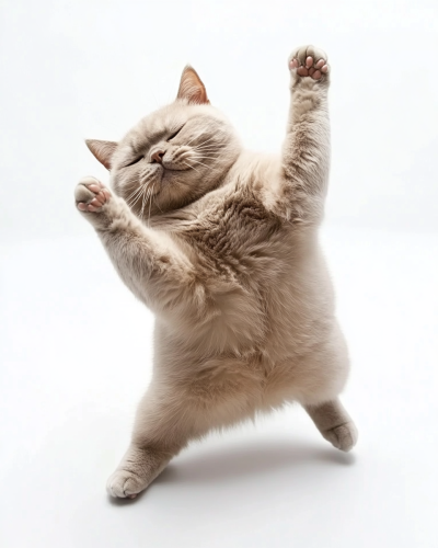 portrait photograph of a stocky british shorthair cat is dancing on the floor, gymnastic posture, lovely expression, isolated on white background --ar 4:5 --style raw