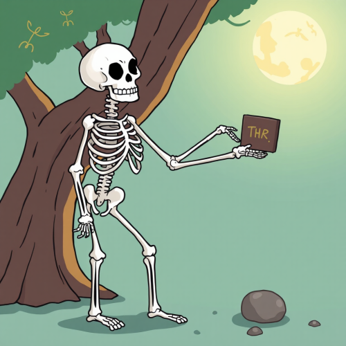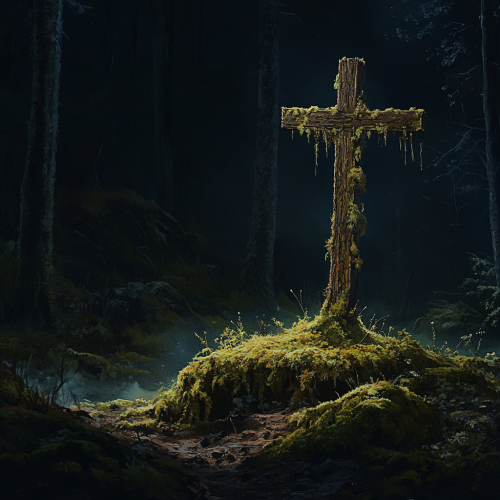 A night scene of a sinister, gloomy forest. In a small clearing stands an old wooden cross covered in moss, beneath which lies a grave. Stuck into the grave is a rusty rod, covered in moss and dirt