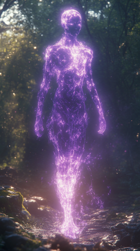 A glowing purple humanoid figure floats gracefully in the air within a dense, serene forest. The figure emits an intense, radiant purple light, illuminating the surrounding trees and casting ethereal reflections on the forest floor. The figure's pose is calm and serene, exuding a sense of spiritual energy and power. The forest is lush, with tall trees, moss-covered rocks, and patches of soft grass, bathed in the glowing light from the figure. The atmosphere is mystical and enchanting, with the intense glow creating an otherworldly presence in the peaceful, natural setting.