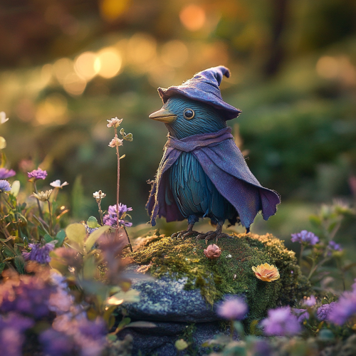 8:04 tilt-shift focus of an old japanese wooden blue wren wizard puppet on a mossy rock in a field of flowers. Spring-time green and violet colours with some warm amber lighting. Warm dusk lighting. Enchanted vibe. --v 6.1
