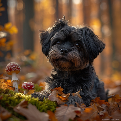 A surreal and dreamlike photograph captures a black shih tzu dog lying on a patch of green moss surrounded by autumn leaves in a serene forest setting. The dog, positioned slightly to the right of center, has a light tan coat with darker facial markings and a prominent dark gray muzzle. Its expression is calm and contemplative as it looks slightly to the left of the camera. The dog's muscular body is partially submerged in a large shallow puddle of water, creating a mirror-like reflection that doubles the visual impact. To the left of the dog, there are several red mushrooms with white spots, adding a whimsical touch to the scene. The foreground is adorned with scattered autumn leaves in shades of orange, brown, and yellow, some floating in the air, emphasizing the season. The midground features the dog lying on the moss and leaves, while the background consists of a blurred autumn forest with tall trees and warm-toned foliage, creating a bokeh effect with soft, golden lights. The overall mood is peaceful and nostalgic, enhanced by the warm, natural lighting and rich autumn colors. The image has high contrast, moderate saturation, and balanced luminance, contributing to its realistic yet dreamlike quality. The image has a shallow depth of field, emphasizing the dog and its immediate surroundings while keeping the background softly blurred --s 750 --v 6.0
