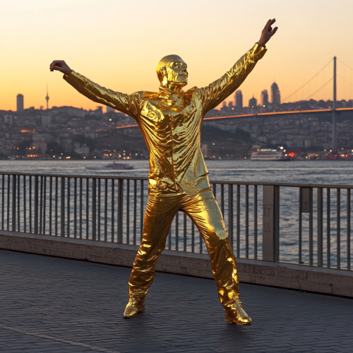 A man resembling the Oscar statuette dances gracefully on the Bosphorus Bridge in Istanbul at sunset. His golden attire reflects the warm light, with the city skyline and calm waters in the background.