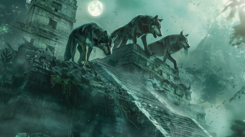 The image consists of 3 elements. First element: 3 luisones (werewolves), normal-sized, walking upright with claws, their bodies covered in fur, standing on a half-collapsed Mayan pyramid. Second element: The Mayan pyramid is medium-sized, half-collapsed, covered in moss and verdigris. Third element: A nocturnal setting with an absence of light, a full moon, and fog. Hyperrealistic photographic quality. --ar 16:9 --v 6.0 --style raw