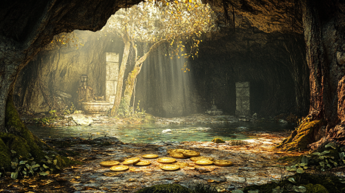 A lone figure, shrouded in a flowing, iridescent cloak with intricate, swirling patterns, stands serenely at the water's edge, surrounded by a gathering of small, gentle woodland creatures, including a fawn, a fox, and a squirrel, in a mystical clearing. Towering, ancient trees, adorned with glowing, ethereal moss and delicate, lace-like vines, stretch towards the sky, their gnarled branches tangled in a canopy of soft, feathery leaves. The crystal-clear pond, reflecting deep, rich hues of plum and amber, radiates a soft, luminescent glow, as if infused with an otherworldly essence. Wafting, misty tendrils rise from the pond's edge, carrying the sweet, heady scent of blooming wildflowers. Warm, golden light, reminiscent of a serene sunset, bathes the scene, casting a mystical, dreamlike quality, as if the very fabric of reality is infused with magic. Inspired by the enchanting, mystical realism of Kinuko Y. Craft, the whimsical, dreamlike quality of James Gurney, and the intricate, ethereal landscapes of Amy Brown. --v 6.1
