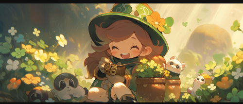 irish Leprechaun with a pot of gold and a rainbow, four-leaf lucky clover, cinematic, folklore --ar 21:9 --niji 5 --s 750