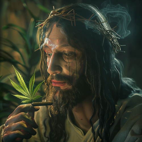 A hyper realistic photo of Jesus holding a huge pot leaf and he has a lit joint in his mouth