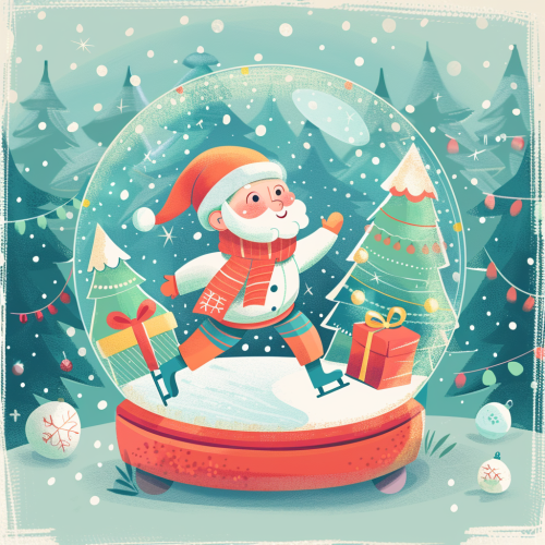 generate an illustration of a snow globe. inside of the snowglobe are evergreen trees, a christmas tree with christmas presents under it, and an ice rink. It is snowing. There is also a christmas character wearing a santa hat and avred scarf inside the snowglobe. . he is wearing ice skates and he is smiling at us from the snowglob --v 6.0