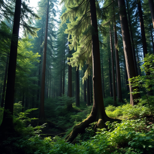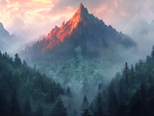 A tiny lonely mountain peak in a vast temperate forest. The trees are massive, old, thick, green, and the forest is seemingly impenetrable, with no clearings, and many different kinds of trees reaching to the horizon. The forest has a mystical energy about it. A tiny mountain peak appears in the center. The mountain is colored red by a setting sun, as are the clouds. Fantasy RPG setting, wide angle, detailed. Wild nature, dramatic atmosphere. --ar 4:3 --v 6.1