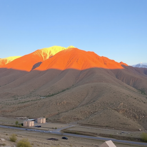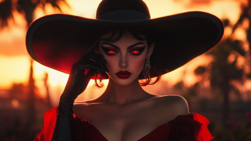 Lady Dimitrescu with red eyes and in a red dress and long black gloves. Thick body. Large black hat pulled down low, almost over her eyes. Palm trees in the background as the sun sets. Hip. Cool. --ar 16:9