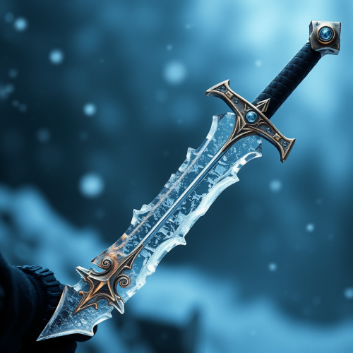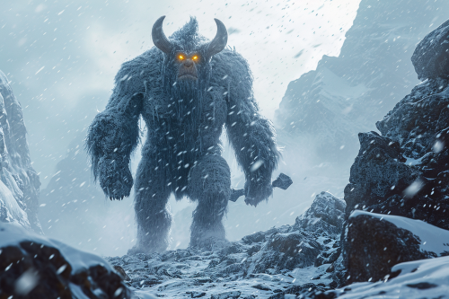 cinematic full body picture of a giant yeti, glowing yellow eyes, large ice horns, standing tall on two legs, holding a hammer made of ice, skin made of ice stone, facing the camera in a moody winter mountain landscape during a snow storm --ar 9:6 --v 6.0