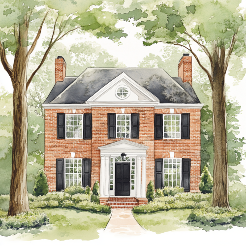 A watercolor illustration of a charming brick house with black shutters, white-trimmed windows, and a black front door framed by two white pillars. The house is centered with tall, symmetrical trees on each side, creating a balanced and inviting scene. The style is delicate and elegant, with soft brushstrokes and muted tones, capturing a refined and picturesque look. The surrounding trees and greenery add a touch of whimsy, while the background is light and minimal to keep the focus on the house. Rendered in a 16:9 aspect ratio.