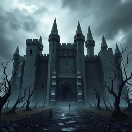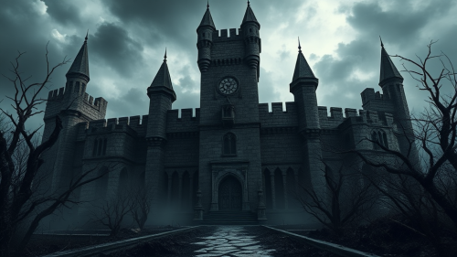 A dark, eerie forest at night. The trees are tall and densely packed, with twisted branches that block out most of the moonlight. The ground is uneven, covered with dead leaves and patches of fog rolling through.