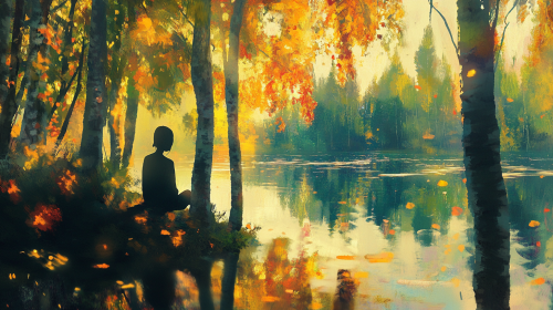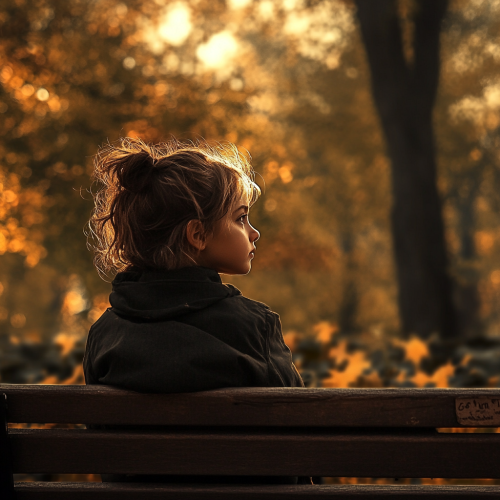 a photorealistic image of an 11 year old girl with messy hair sitting on a park bench all alone during sunset in the fall, tall green and brown trees behind her