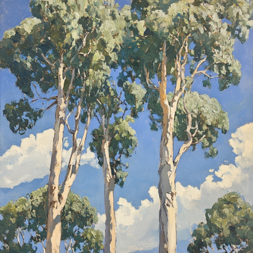 oil, painting of three full-size mature eucalyptus trees, showing the entire height of the trees, the sky above into the sides with one tree a little bit further from the other two trees in a Maynard Dixon style