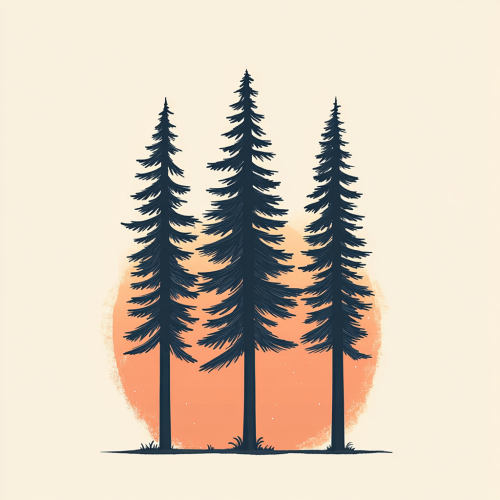 minimal ilustration of 3 tall pine trees with variation in height. in a retro and minimal design style. inspired by national park post card style. no background. only 3 colors max. simple pine tree shapes