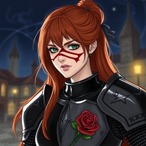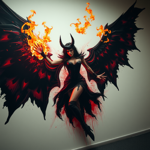 illustrated manuscript, female devil wearing heavy dark armor, halo of fire, flaming sword, pale skin, full body, large red wings, flying in night sky --ar 16:9