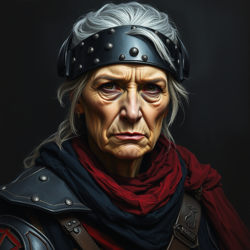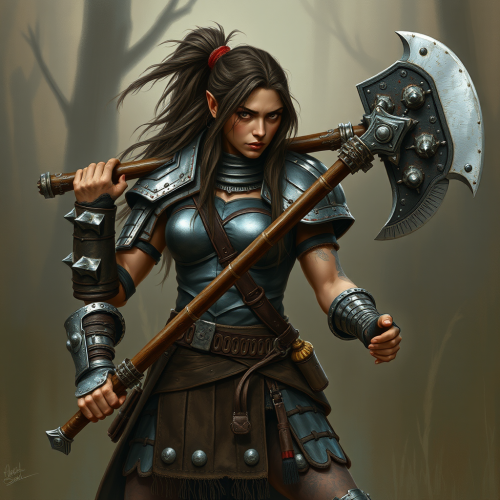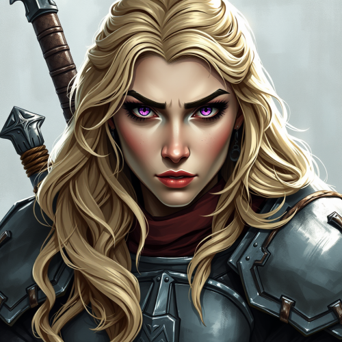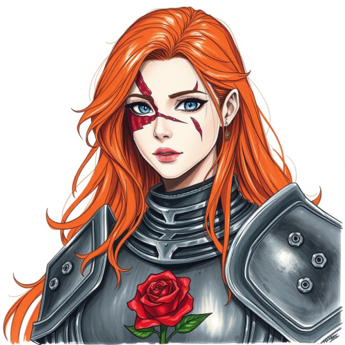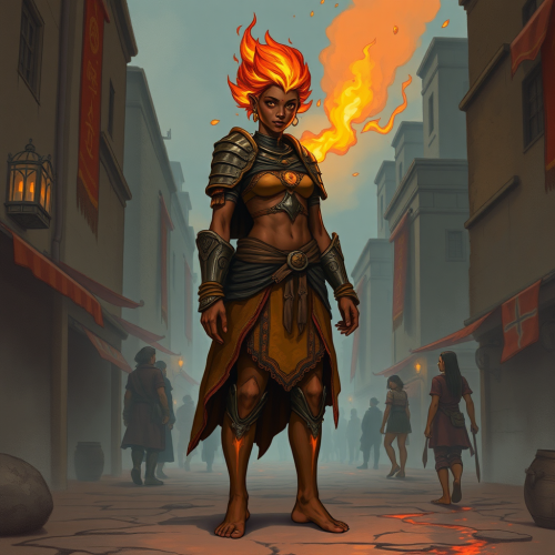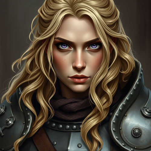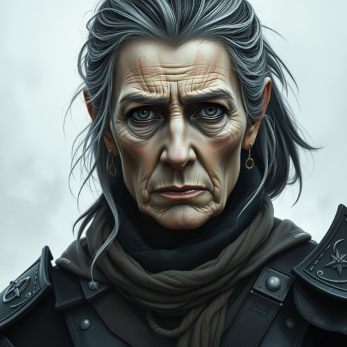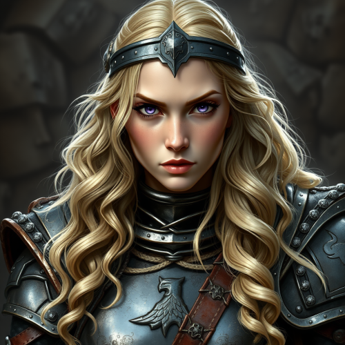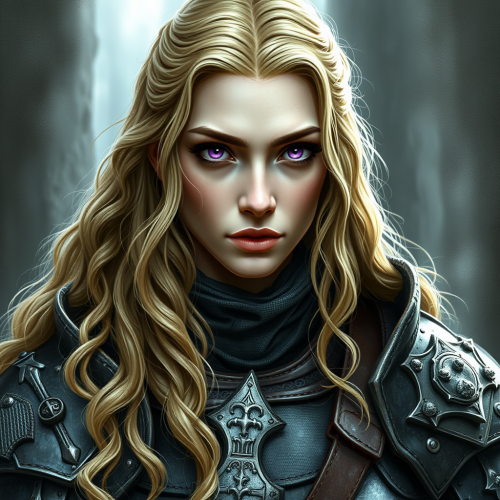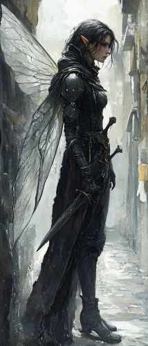 Female half orc fighter in heavy armor with a sword and shield. Dark Fantasy setting. The mood is ethereal. Watercolor art style with soft washes of color and fluid details. The background is a medieval city with some white space. --no tusks --ar 3:7