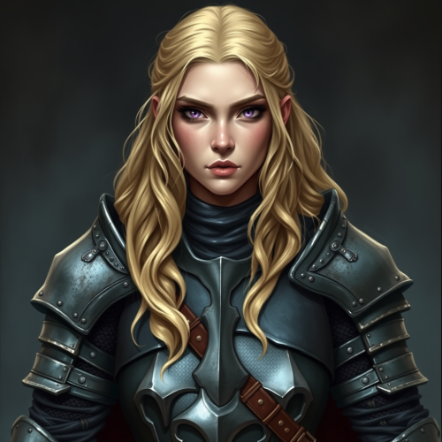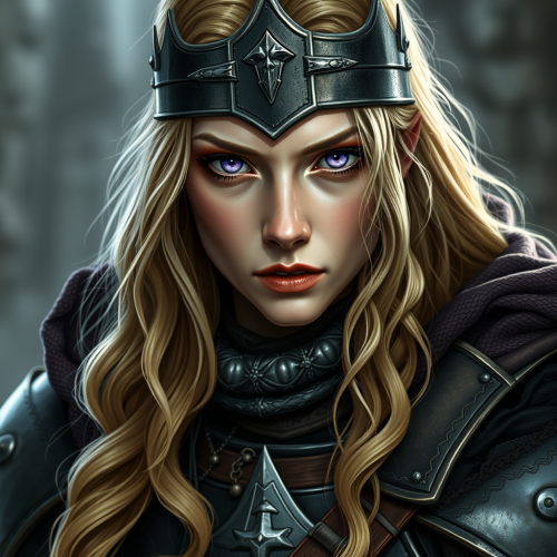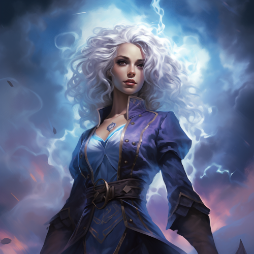 in the style of a oil painting a female air genasi from dungeons and dragons. she has white straight hair that curls down. the air genasi has blueish white skin and deep purple eyes. the air genasi is a shadow magic sorcerer. in the backround the moon is rising and it is very cloudy with lightning striking next to the air genasi.