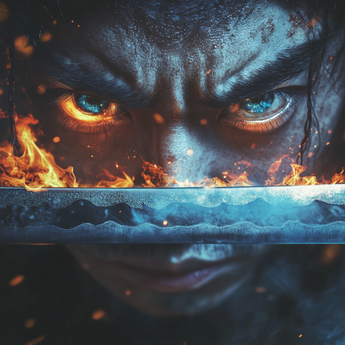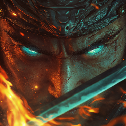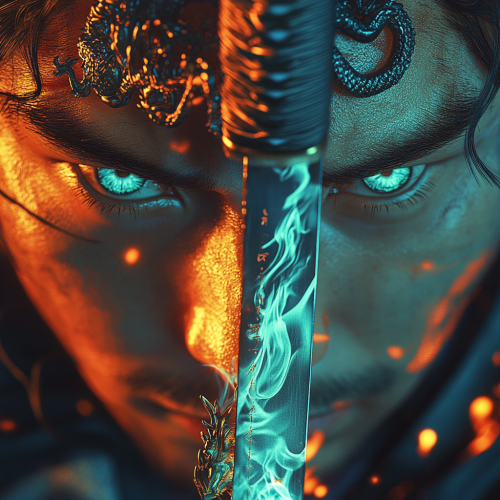Close-up of a samurai holding a katana horizontally under the eyes, katana burns with turquoise flame with the silhouette of a dragon, dragon eyes, dragon scales on his temples, turquoise flame is reflected in the eyes, realistic style --v 6.1