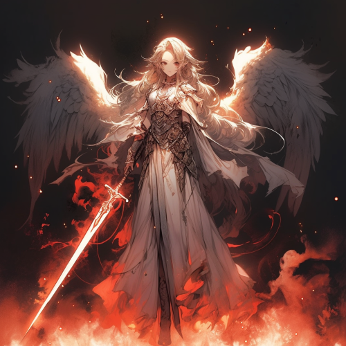 Epic fantasy female angel with flame wings, holding a sword, wearing armour --niji 5