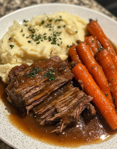 amateur photo from reddit. taken with an Iphone 15 pro. A hearty plate of tender braised pot roast, pulled apart with a fork, served with roasted carrots and creamy mashed potatoes. The roast is smothered in a rich, savory gravy, and the carrots are glazed, adding a sweet contrast to the savory flavors. The mashed potatoes are smooth and fluffy, with a perfect balance of buttery richness., natural lighting, savory plating: e --ar 61:78