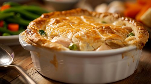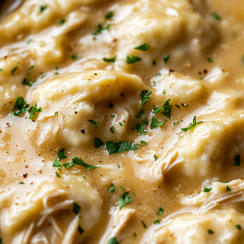 A close-up of creamy chicken and dumplings in a rich, thick gravy. The dumplings are fluffy and golden on top, covered in a smooth, savory sauce with bits of tender shredded chicken visible. Garnished with freshly chopped parsley for a touch of color, the dish exudes warmth and comfort. The lighting is warm and cozy, enhancing the creamy texture of the gravy and the moist, tender look of the dumplings.