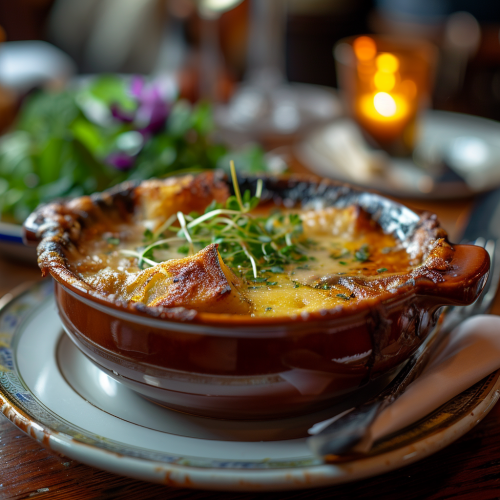 food photography style, french onion soup at a 5 star french restaurant in Paris, --s 500 --v 6.0