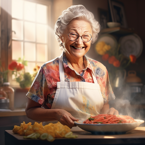 realistic portrait of cheerful italian grandma cook wearing an apron, sunlight, cinematic, --v 5.2 --style raw --s 250