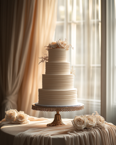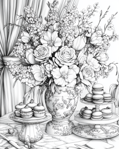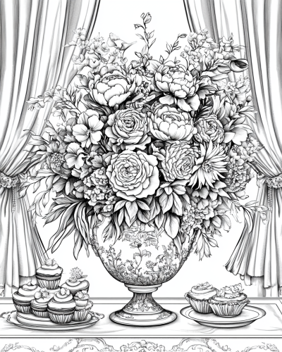 Create a black and white coloring page illustration of an arrangement of gladiolas and Roses and tulips and chrysanthemums and lilac and wax flower and curly willow branches and small filler flowers and foliage arranged in a tall Chinese Vase. The vase sits on a beautiful Victorian style dessert table in a drawing room. There is a tiered tray with mini cakes and macarons arranged neatly. A few dessert plates and napkins are next to the tiered tray. There are drapes in the background. The lines are thick and no shading or shadows on this illustration. --ar 4:5 --v 6.1 --stylize 300