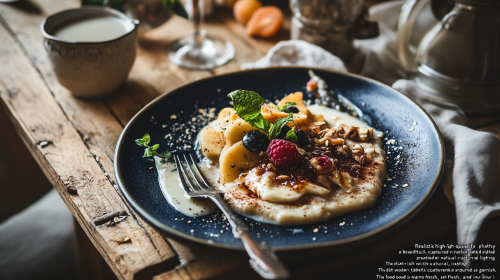 "Realistic high-quality close-up of a beautifully plated dish of [nome della ricetta], captured in natural lighting. The dish is presented on a rustic wooden table with subtle, fresh ingredients scattered around as garnish. The food is warm, fresh, and inviting, with visible textures and vibrant colors. The setting includes small touches, like a folded napkin, silver cutlery, and a glass of water in the background, giving the scene a cozy, appetizing feel." Overnight oats : 50 g de flocons d’avoine, 150 ml de lait d’amande, 1 banane tranchée et 1 cuillère à café de cannelle. --ar 16:9