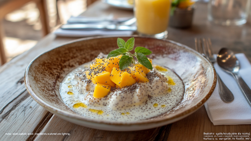 "Realistic high-quality close-up of a beautifully plated dish of [nome della ricetta], captured in natural lighting. The dish is presented on a rustic wooden table with subtle, fresh ingredients scattered around as garnish. The food is warm, fresh, and inviting, with visible textures and vibrant colors. The setting includes small touches, like a folded napkin, silver cutlery, and a glass of water in the background, giving the scene a cozy, appetizing feel."Chia pudding : 30 g de graines de chia mélangées avec 200 ml de lait de coco et 100 g de mangue coupée en dés, laissé reposer toute la nuit. --ar 16:9