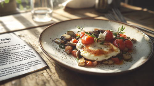 "Realistic high-quality close-up of a beautifully plated dish of [nome della ricetta], captured in natural lighting. The dish is presented on a rustic wooden table with subtle, fresh ingredients scattered around as garnish. The food is warm, fresh, and inviting, with visible textures and vibrant colors. The setting includes small touches, like a folded napkin, silver cutlery, and a glass of water in the background, giving the scene a cozy, appetizing feel." Omelette : 2 œufs, 50 g de champignons, 50 g de tomates et 30 g de fromage feta. --ar 16:9