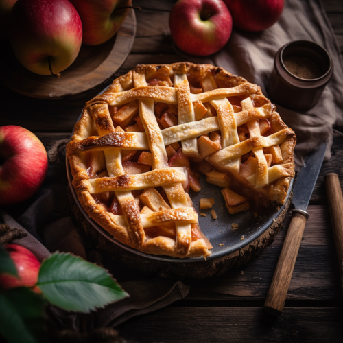 : Classic Apple Pie Perfection, Warm Reds and Golden Tones, Sunlit Afternoon Glow, Overhead Shot of Sliced Apple Pie, Rustic Wooden Table Setting –ar 4:5