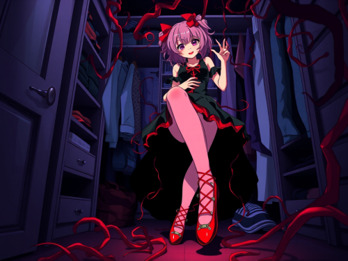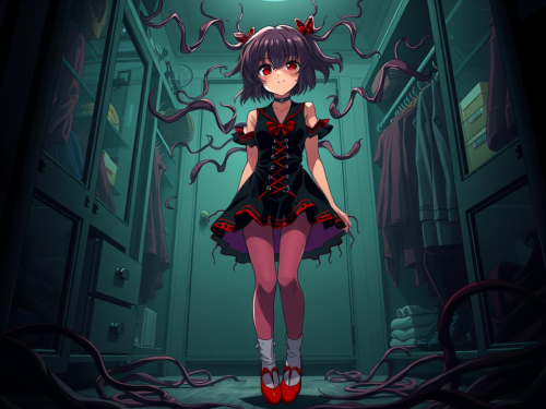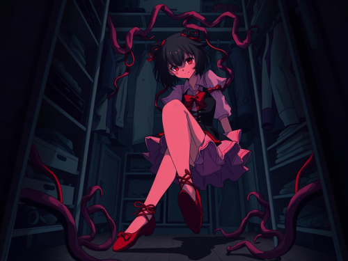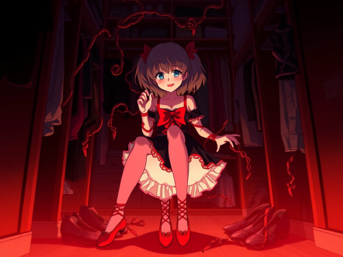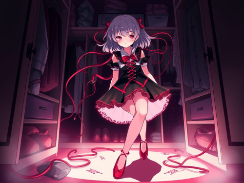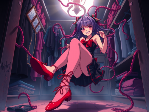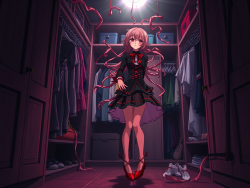 Madoka Kaname possessed by ghostly ballet flat shoes in closet.