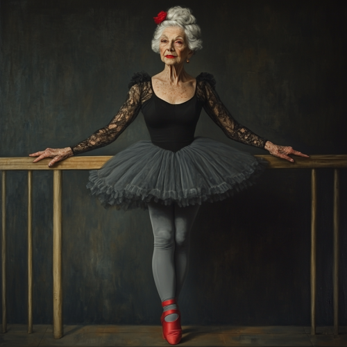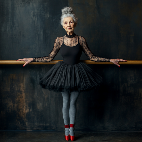 A 70-year-old ballerina in a short and puffy black skirt and gray tights, wearing red ballet shoes. Her gray hair is styled in a bun, her face shows many wrinkles, and she has bold red lips. She is standing by a ballet barre against a dark background